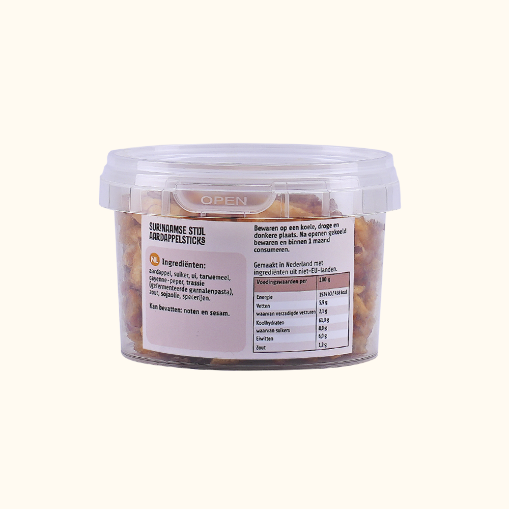 Potato, sugar, onion, wheat flour, cayenne pepper, trassi (fermented shrimp paste), salt, soybean oil, spices.